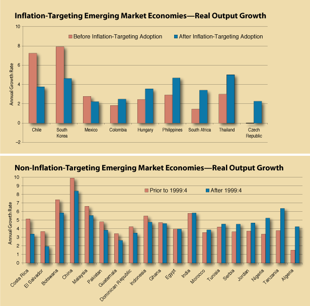 The IMF study compares inflation and economic growth in 13 EMEs that adopted inflation targeting (IT) between 1998 and 2002 to a control group of 29 countries that did not. Countries that adopted IT subsequently experienced both a lower rate of inflation and reduced inflation volatility. The report suggests, however, that IT countries experienced only a modest boost in economic growth relative to the control group. Figure 2 compares the experience of the IT countries (upper panel) that had annual inflation rates below 40 percent when they adopted IT (9 of the 13), and the control-group countries (lower panel) that had annual inflation rates below 40 percent at the end of 1999 (19 of the 29).8 For the IT countries, 6 of 9 experienced more rapid growth after adopting IT; the median annual growth rate increased to 3.5 percent from 2.8 percent. For the control-group countries, 8 of 19 experienced more rapid growth; the median annual growth rate increased to 4.5 percent from 4.2 percent.