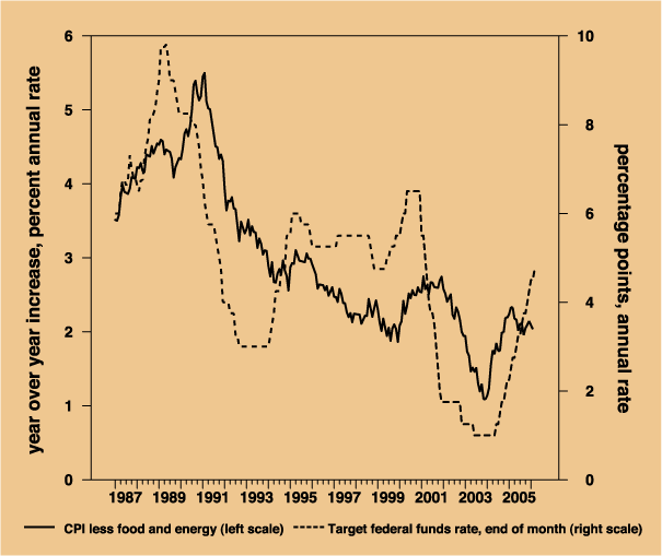 Through May of this year, the FOMC had increased its target level for the federal funds rate at 16 consecutive meetings. The figure at right compares the FOMC's target level for the federal funds rate and the core inflation rate (measured as the year-over-year increase in the consumer price index [CPI] less food and energy) since 1987, the first year of Alan Greenspan's tenure as chairman of the Federal Reserve. Both have trended downward, with changes in the FOMC's federal funds target tending to precede changes in inflation. Further, the size of changes in the rate target (right scale) are much larger than changes in the inflation rate (left scale), a result of the FOMC's seeking to temper inflationary pressures in advance of actual changes in inflation.