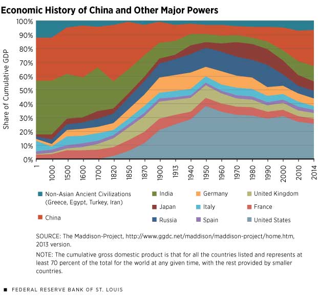 The second view sees China's dramatic rise simply as destiny. It is returning to its historical position: China had been one of the richest nations and greatest civilizations (alongside India) from at least 200 B.C. to 1800, the dawn of the Industrial Revolution in England. (See Figure 1.) It was only a matter of time for China to reclaim its historical glory and dominate the world once again. (As Napoleon once said, "Let China sleep, for when the dragon awakes, she will shake the world."2)