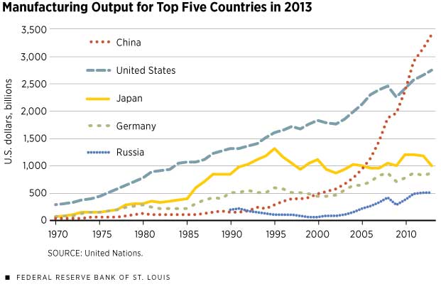 Figure 2 shows the manufacturing output of the top five countries in the world between 1970 and 2013. In the early 1970s, when President Richard Nixon visited China, it produced very few manufactured goods—a tiny fraction of the U.S. level. About 1980, China's manufacturing started to take off, surpassing the industrial powers one by one, overtaking the U.S. in 2010 to become the No. 1 industrial powerhouse.