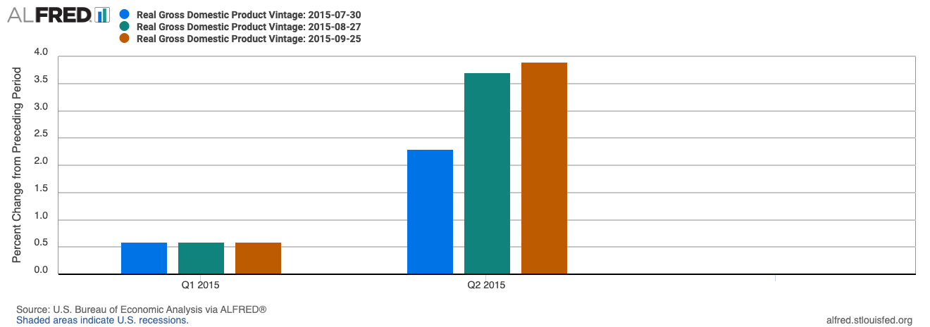 To illustrate, the following graph from the St. Louis Fed’s archival database, ALFRED, shows the first, second and third estimates of real GDP growth for the second quarter of 2015.